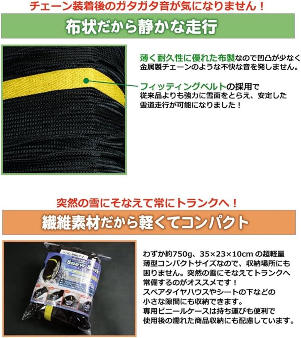 本商品はあくまでも急な積雪時などの緊急用としてご使用ください。タイヤ形状や偏平率、空気圧等の条件によっては適合サイズであっても装着しにくい場合や車種によっては装着ができない場合がございますので予めご了承ください。