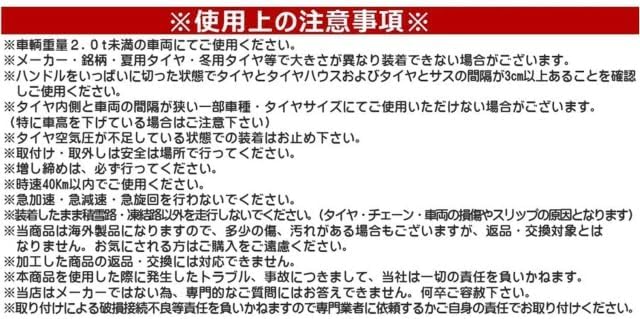 ■ジャッキアップ不要で取り付け可能 ■横滑りに強く静寂性に優れた亀甲型 ※事前に、取り付け、取り外し練習を行ってください ※タイヤチェーン装着時は30km/h以下で走行してください。(高速道路も同様)※この商品はラジアルタイヤ(夏用タイヤ)基準となっております。スタッドレスタイヤなど、一部装着できない場合があります。※装着にはタイヤと車体の間隔(クリアランス)が5cm以上必要です。また、車体と積載物の合計重量が2t以内でないと装着できません。 ■チェーン幅:9mm ■乗用車用 ※貨物自動車全般やトラック(1BOXバン/ミニバンを含む)には使用できません。(車輌重量2.0t未満) 適合タイヤサイズ:195/85-16 205/55-19 205/70-17 205/70-17.5 205/75-16 215/60-17 215/65-17 215/80-14 225/45-19 225/50-18 225/70-14 230/60-15 230/65-15 235/30-20 235/35-19 235/35-20 235/40-19 235/45-18 235/50-17 245/30-19 245/35-18 245/45-16 245/50-15 245/50-16 245/60-14 255/30-18 255/45-15