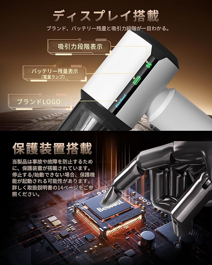 ✅【新開発!!LEDディスプレイ!!驚きの40KPa吸引力!3段階吸引力】BeeToolハンディクリーナーは先進的LEDディスプレイを搭載し、吸引力のレベルやバッテリー残量、充電状況などを一目で確認でき、より効率的な掃除をサポート。★★このハンディクリーナーは省エネ、長寿命、低騒音、小型・軽量の特長を持つブラシレスモーターを採用し、吸引力が40KPaに達し、従来の掃除機より55%アップ!一度でしっかり吸い取り効率的なお掃除を実現します。★★★このハンディ掃除機はワンタッチでエコ・標準・強力3段階吸引モードを簡単に切り替えられ、より快適な使用体験をもたらします。