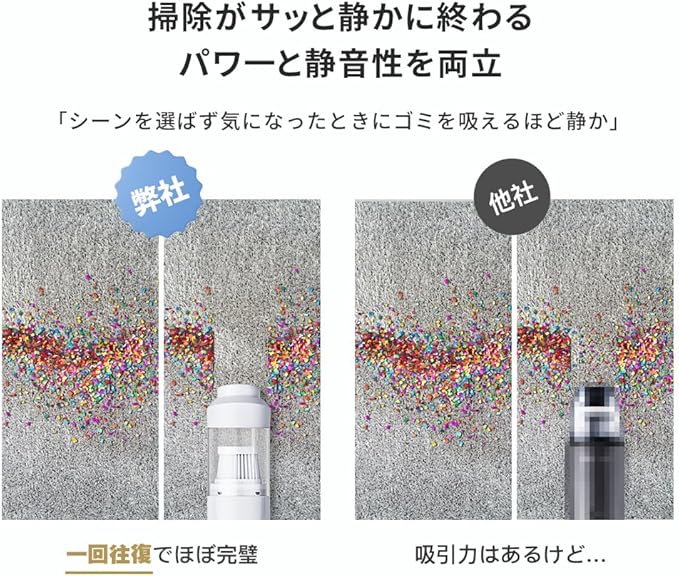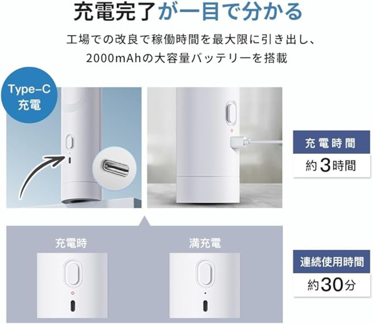 2000mAh の大容量電池と高速充電:2000mAh の大容量電池で、最大 30 分間の連続使用が可能です。充電も高速で、最短 3 時間で満充電になります。急いで車内を掃除したいときでも、すぐに使用できるようになっています。