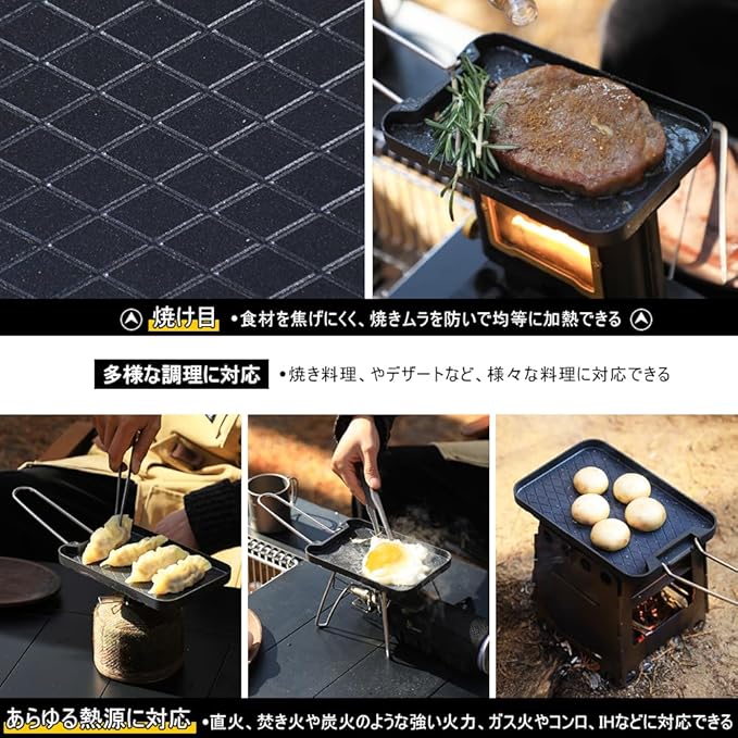 あらゆる熱源に対応:グリルトレーの底部にステンレス鋼複合加工が施さたので、直火、焚き火や炭火のような強い火力、ガス火やコンロ、IHなどにあらゆる熱源に対応できます。