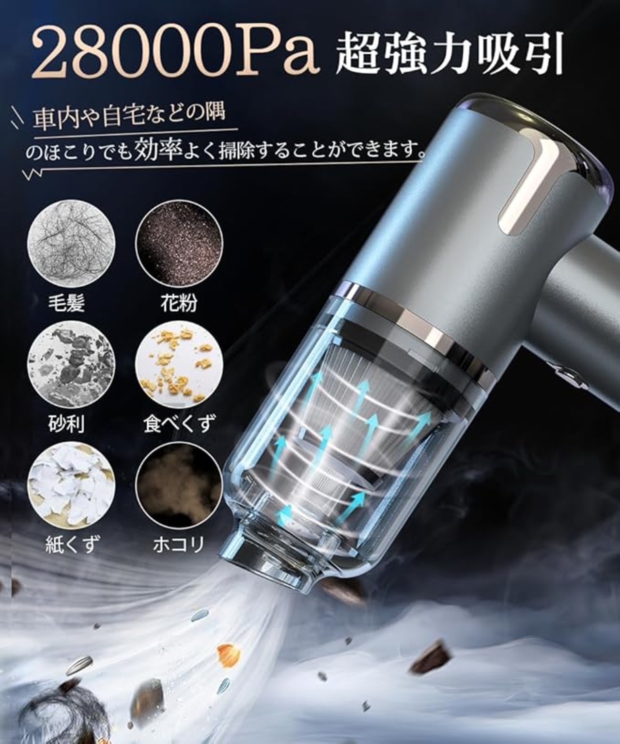 【ブラシレスモータ搭載・超強力モーター】この車用掃除機はブラシレスモータとを採用して、普通なブラシモーターと比べては長寿命/低騒音/電磁ノイズが少ない/省エネが可能/効率がよく/メンテナンス性など利点があります。アップグレードされた超強力モーターを採用、最大28000Paの吸引力をサポートし、ゴミをを逃さずしっかり吸い取ってくれます。場所を選ばずどこでも簡単に使えるようになりました。