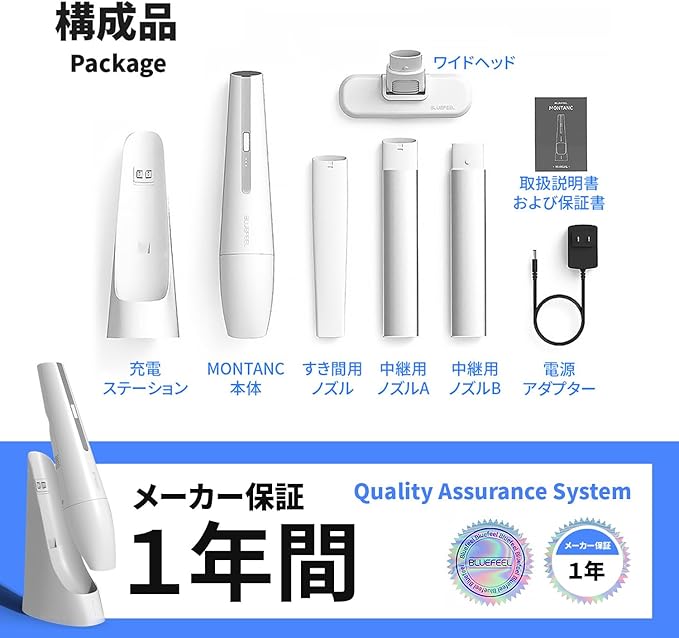 BLUEFEEL MONTANC PRO コードレス ハンディクリーナー [ 強力吸引 16900Pa ハンディ掃除機 超軽量550g コンパクト 低騒音 隙間用ノズル 中継用ノズル 車用 スタンド 充電 ] ホワイト BLF26252 【国内正規品】 | KAZESHOP