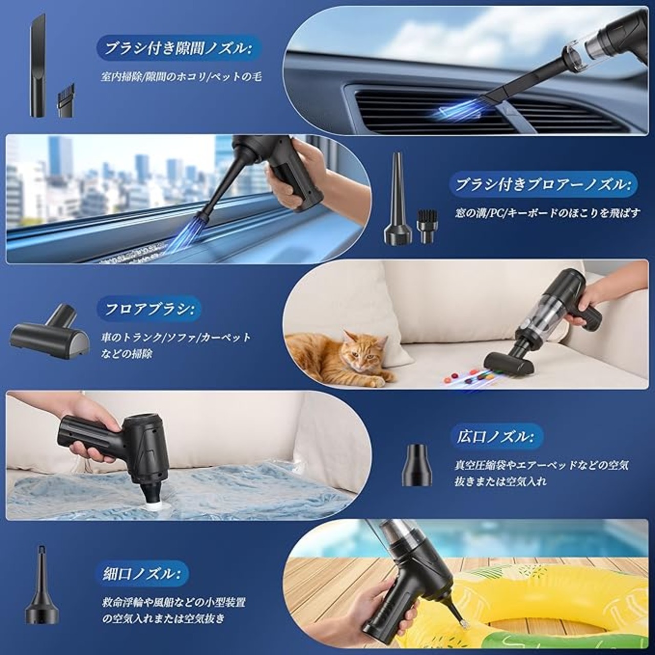 【多機能4-in-1車用 ハンディクリーナー コードレス】✅吹き飛ぶ✅ 吸い込む ✅空気入れ ✅空気抜き 交換可能なノズルが付属しています。7種類のノズルで、吸引機能と送風機能を搭載し、ホコリやペットの毛を取り除くだけでなく、屋外でのエアベッドの膨張や圧縮袋の真空排気にも使用できます。コードレスで設置場所・掃除場所にかかわらず使いやすい、ハンディクリーナーの理想といえる製品です。