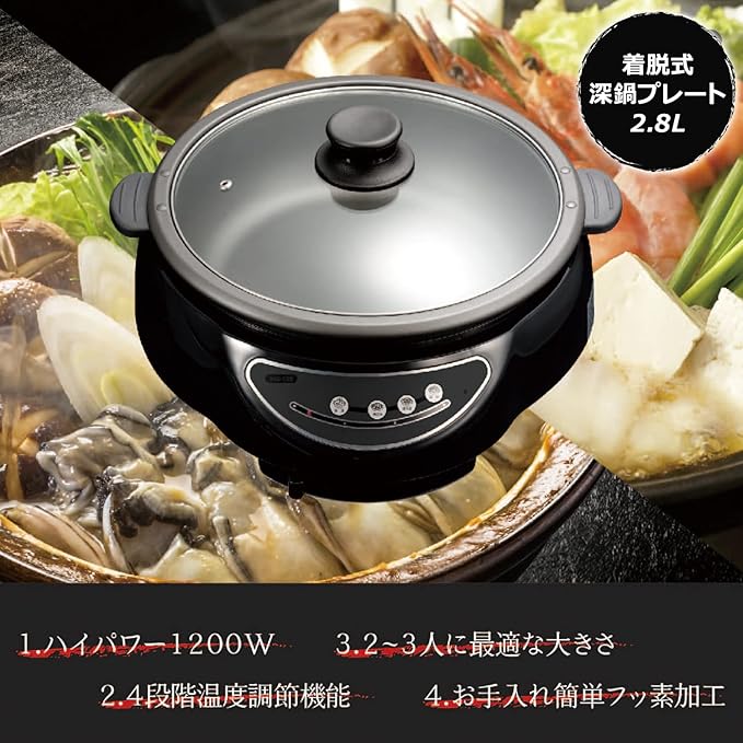 [機能] 4段階調整温度調整 / ハイパワー1200W /フッ素加工コーティング / 着脱式深鍋プレート