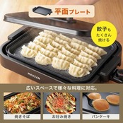 3つのプレートでレパートリーが広がる※お選びのモデルによってプレートの種類が異なります。 1.平面プレート:広いスペースで様々な料理に対応。 2.焼肉プレート:油落とし穴があり、美味しくヘルシーに。水受け皿付きで減煙効果も。 3.たこ焼きプレート:区切り線を目安に丸めてきれいに焼けます。