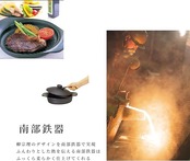南部鉄器は、熱を逃がさず保有し、ふんわりとした熱を常に均一に行き渡らせるので、煮物は煮くずれなくふっくらと柔らかく煮え、焼き物は焼き色を均一にきれいにつけるなど美味しい料理づくりを手助けしてくれます。重みのある鉄ふたを使えば、水分やうまみをとじこめます。煮る、焼く、蒸す、オーブンでの調理使用だけでなく、卓上へも温かいままサーブできる素材です。重い南部鉄器ですが、鉄鍋はしっかりと支えられるよう左右に張り出したハンドルが使いやすさと同時にデザインの特徴にもなっています。