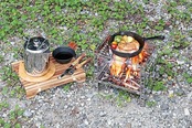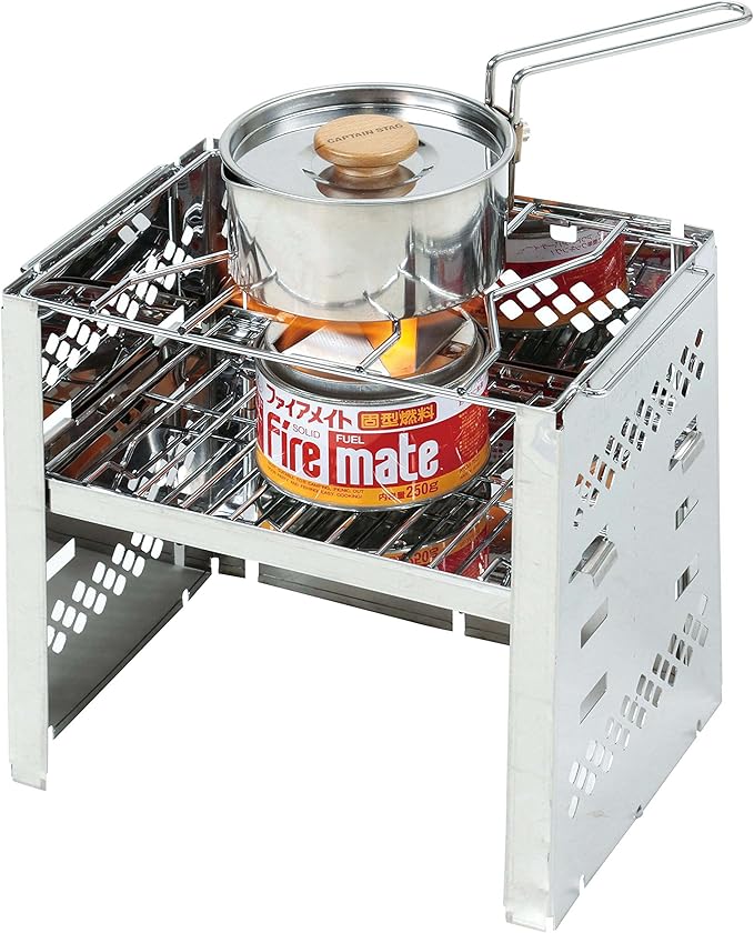 特徴1:ゴトクとアミがセットで煮炊きや焼き物等いろいろ賢くスマートに使える。B5サイズに収納でき、コンパクト。燃料や用途に合わせて炭受けの高さが3段に調整可能。