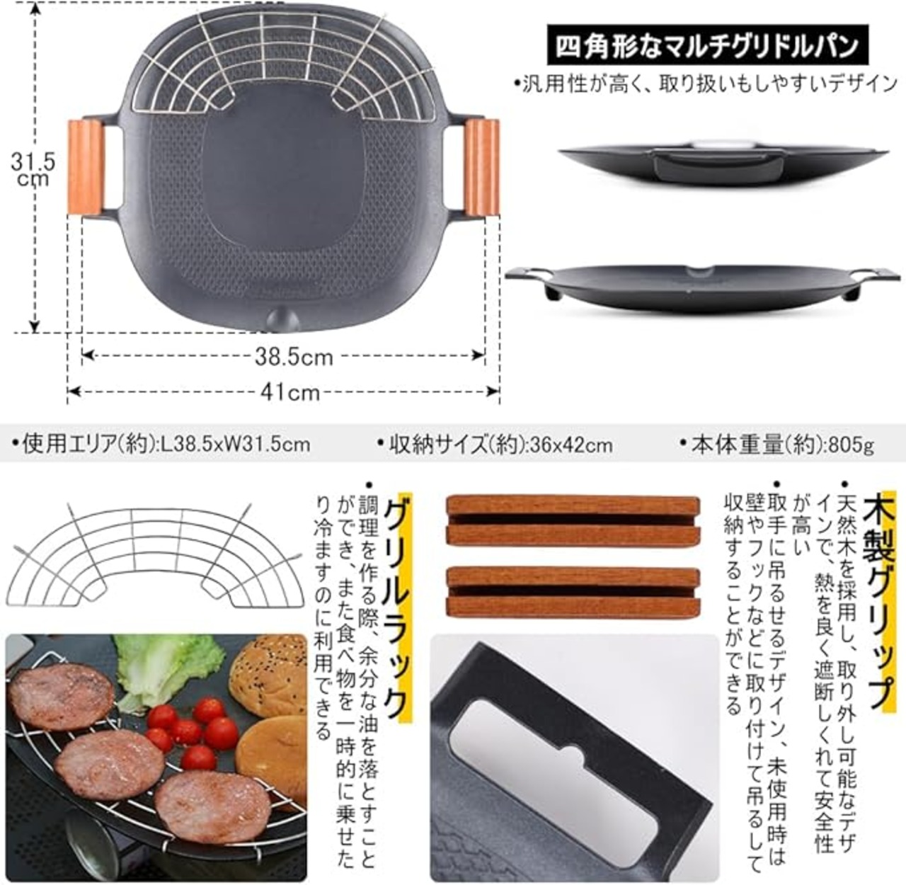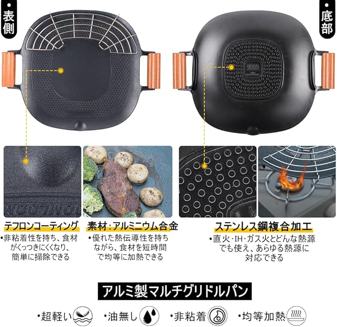 材質:マルチグリドルパンの本体はアルミニウム合金を採用、航空機部品にも使用される素材で、非常に軽量でありながら高い強度を持ち、それに、高い熱の伝導性を備え、耐食性や耐久性にも優れており、長持ち可能です。