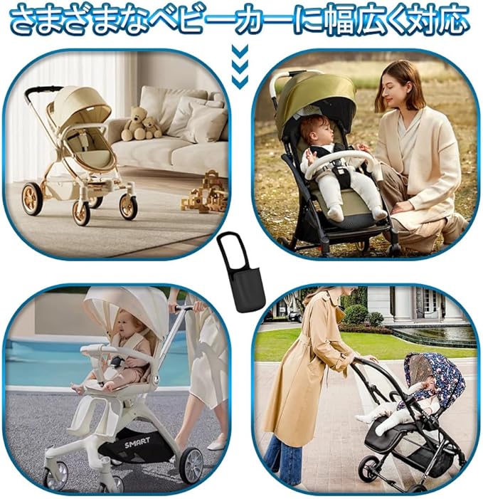 【コンパクトで邪魔にならない】スリムなデザインでベビーカーの収納袋や自転車のスペースを圧迫せず、折り畳み時もそのまま装着可能。