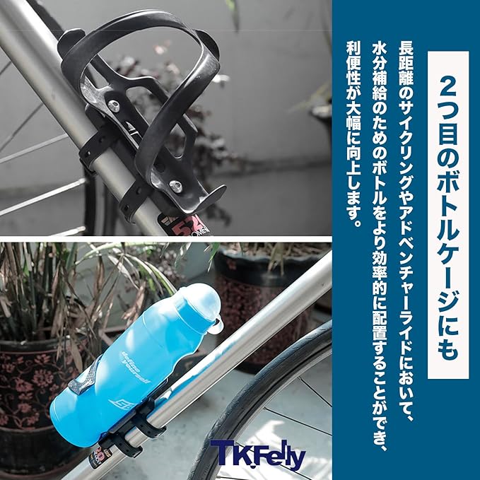 【2つ目のボトルケージにも】既存のボトルケージの位置を調整し、お好きな高さに変更したり、フレームの他の部分に移動させることができます。また、2つ目のボトルケージを追加で取り付けることも可能で、サドルの下などにも取り付けることができます。これにより、長距離のサイクリングやアドベンチャーライドにおいて、水分補給のためのボトルをより効率的に配置することができ、利便性が大幅に向上します。