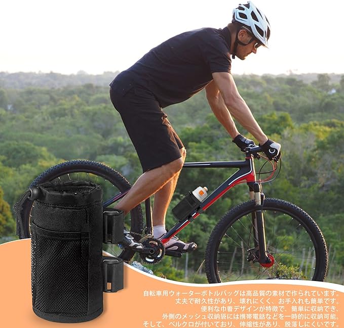 【自転車 ボトルホルダー】便利な自転車ドリンクホルダーです。暑い夏では、飲み物を長時間涼しく保ち、寒い冬では飲み物を効果的に暖かく保ちます。 【製品仕様】自転車ボトルケージはポリエステルと断熱材を採用して、保温断熱効果があり、耐久性に優れます。バッグの底に排水穴があり、手入れも簡単です。高さ約17.5cm、直径約8.5cm。 【大容量】ほとんどのボトル、保温カップ、飲み物などに適用します。外側にはメッシュポケットも付いて、携帯電話、ヘッドフォン、キー、カード、コイン、サングラスなどの小さなアイテムを収容するのに十分です。 【使いやすく】ネジは必要なく、マジックテープで自転車のハンドルまたはフレームに取り付けることができます。ドローストリング設計、ボトルが落ちにくい。 【幅広い用途】自転車だけでなく、電気自動車、オートバイ、ベビーカー、車椅子、ビーチチェア、ヨットなどにも適用します。ハイキング、キャンプ、ジム、旅行、アウトドア活動におすすめ!