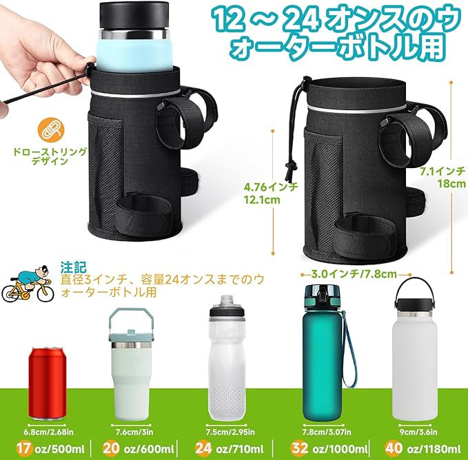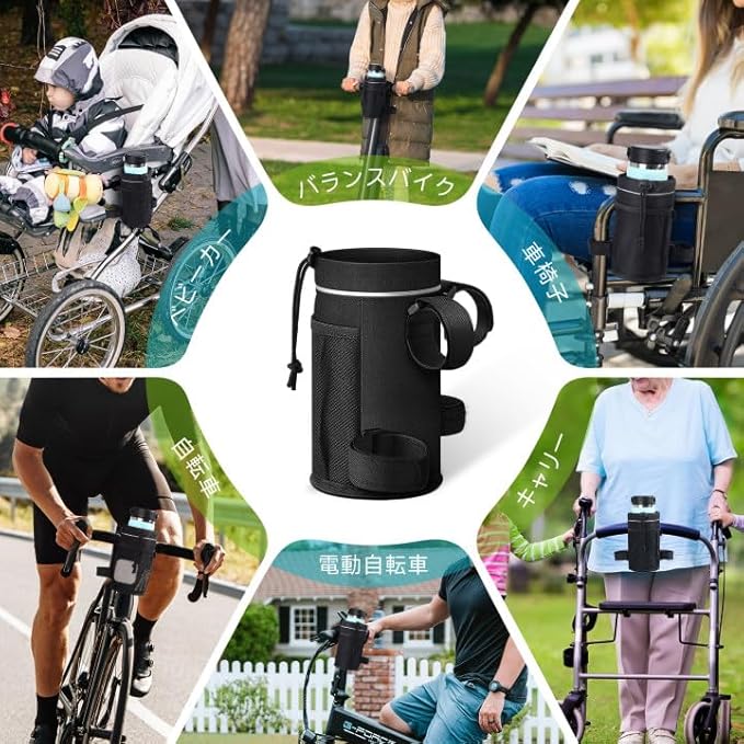 【幅広い用途】自転車だけでなく、電動スクーター/マウンテンバイク/電動自転車/ベビーカー/車椅子/ゴルフカート/スクーター/トレイルバイクなどにも適しており、毎日の通勤、仕事、学校、ハイキング、ウォーキング、フィットネス、ビーチに行く、旅行などに最適です。 このウォーターボトルホルダーは、ウォーターボトルを持つ必要がなくなるため、アウトドア活動が好きな家族や友人への実用的な誕生日プレゼントです。