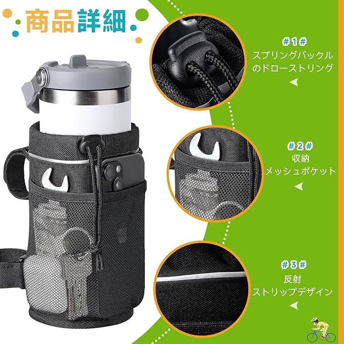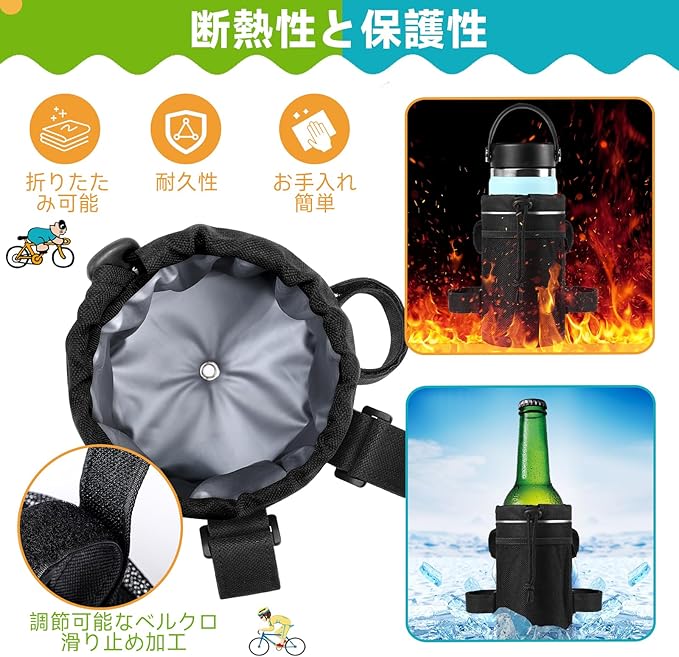 【飲み物を温かく/冷たく保つ】- より厚い断熱層で作られた当社の自転車ドリンクホルダーは、強力な保温効果があります。暑い季節には飲み物を冷たく保ち、寒い季節には暖かく保ちます。バイクドリンクホルダーの外側にはメッシュ ポケットがあり、鍵、ワイヤレス イヤホン、現金、小銭、その他の小物など、運転中に使用するものをポケットに入れることができます。