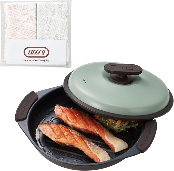 【特典付き】【Toffy/トフィー】 電子レンジ用 グリルパン K-MW3 レンジ調理器 波型プレート 1台6役 焼く/炒める/蒸す/茹でる/炊く/煮る シリコーンミトン付き レシピブック付き K-MW3 (【特典キッチンクロス付き】ペールアクア) | KAZESHOP
