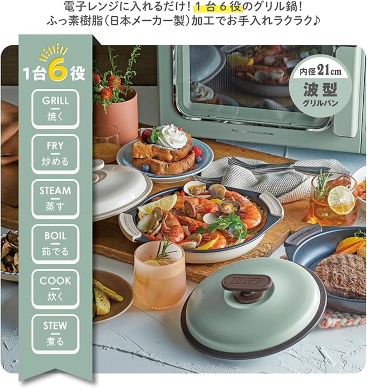 焼く、炒める、蒸す、茹でる、炊く、煮るが電子レンジで全部できる! 1台6役の電子レンジ調理専用グリルパン! グリル調理をしたような焼き目がつく波型プレートを採用し、余分な脂も落ちてヘルシー。 ほったらかし調理で、こんがり焼き目のついた美味しい料理が仕上がります。
