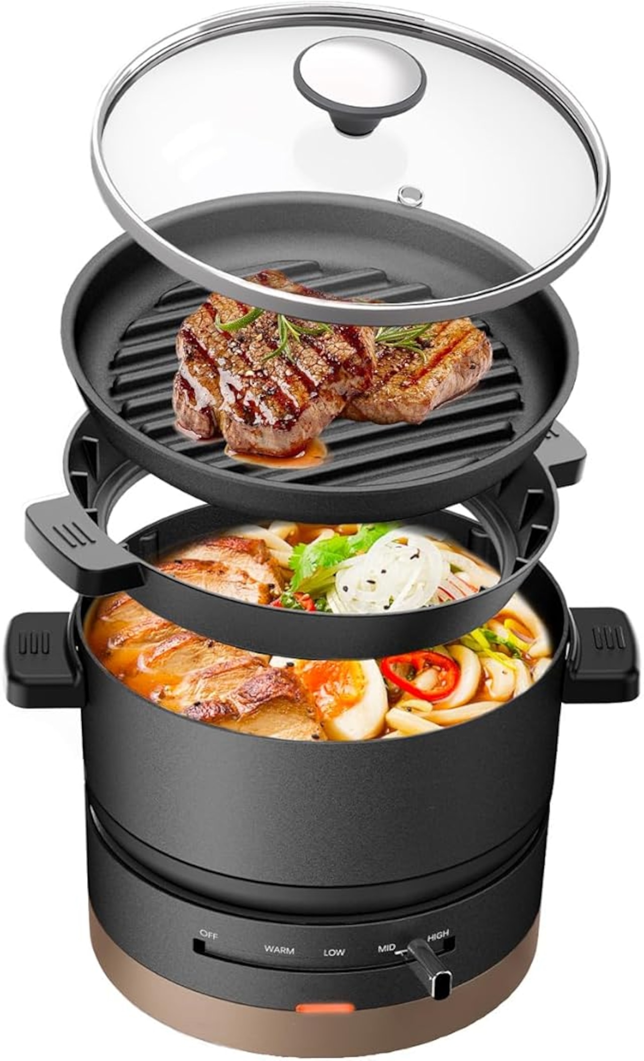 HAGOOGI ホットプレート 電気鍋 2枚タイプ 600W 1.0L 電気 一人用 4段階温度調節 波形プレート ガラス蓋 丸洗い可能 焼肉 一人暮らし用 1人 2人 小型 深鍋 焼肉プレート 車中泊/キャンプ/旅行 | KAZESHOP