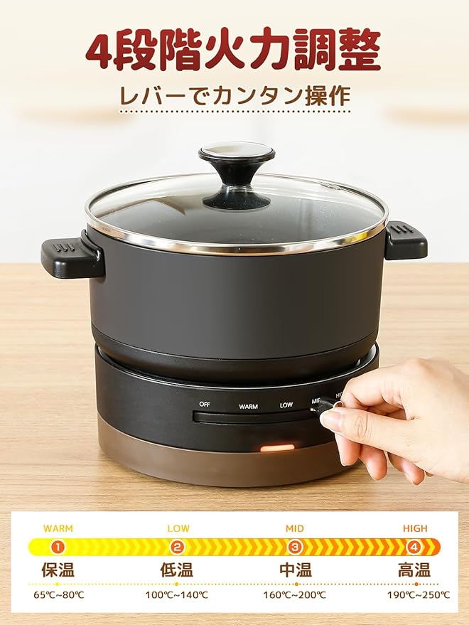 【レバーで4段階温度調節可能】レバーで温度調節できるので、誤って触れてしまう可能性が減り、保温・低温・中温・高温(0〜250 C)火力が選べるので用途に合わせて使い分けが可能。煮物やスープ、味噌汁などを作ったり、カレーやハヤシライスなども作ることができますが、朝食時に目玉焼きとベーコンを焼きます!