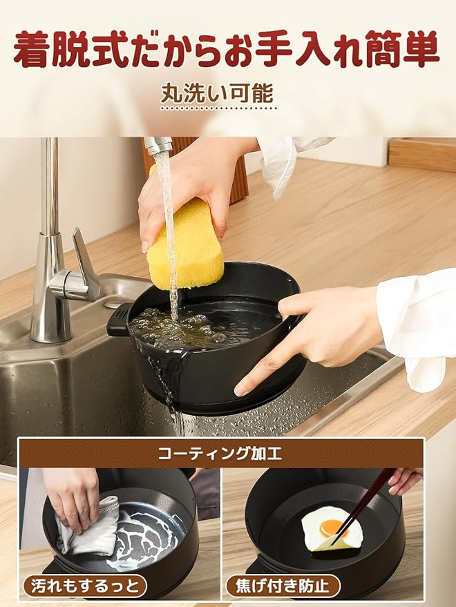 【お手入れカンタン】分離型デザインで、内鍋は取り外せて拭いたり洗ったりしやすく、後片付けの手間を軽減できます。鍋はフッ素加工で焦げ付きにくく、焦げ付きも防げるため、清潔な状態を保てます。 長いハンドルもないので、保管スペースを節約できます。