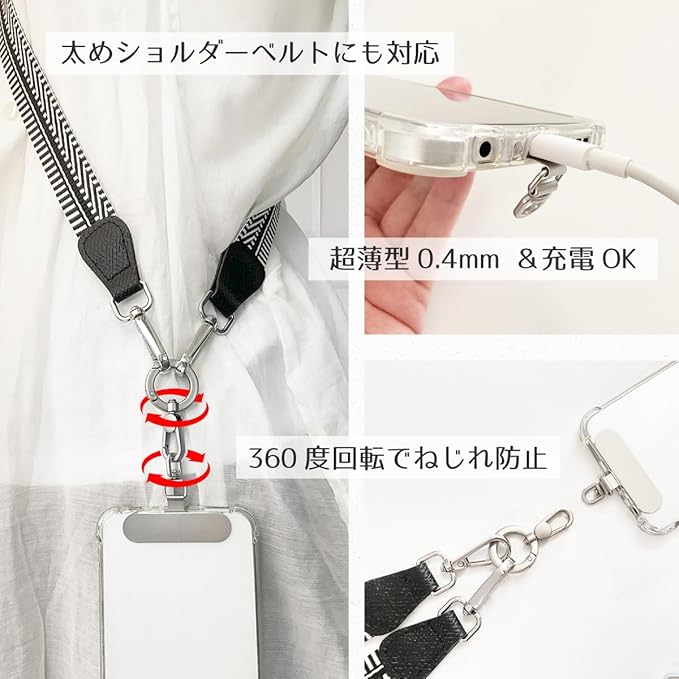 ☑【スマホ落下防止&ショルダーベルト対応】 超薄型0.4mm金属製のスマホホルダー(1個)と、360 回転式カラビナ(1個)の丈夫で高機能、高品質なセット。ホルダーをスマホケースの充電口に差し込むだけで簡単に装着でき、充電を妨げない設計。付属カラビナで太めのショルダーベルトにも対応し、使えるベルトの選択肢が広がります。
