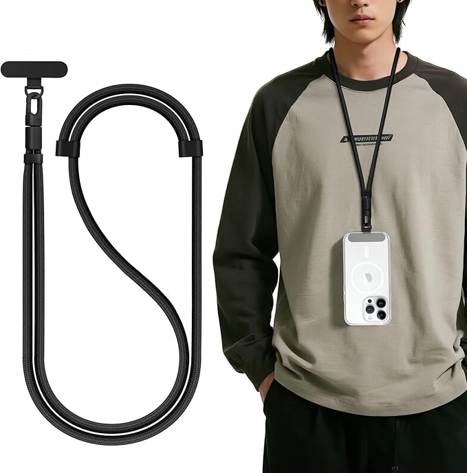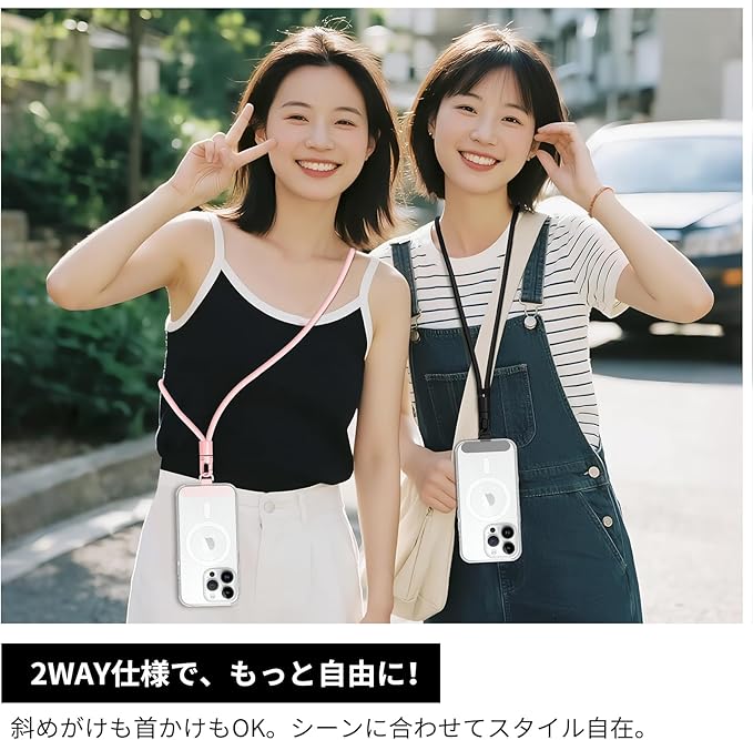 【仕様】⚪パッケージ内容:ショルダーストラップ1本、スマホホルダー1枚。⚪ショルダーストラップ素材:7mmナイロン、着用長さ約41cm~76cm (金具含む)⚪スマホホルダー素材:金属製 、厚さ約0.2mm(浮きなし)。対応機種:iPhone、Samsung、Google、Sony、Xiaomi、Oppo、Aquosなど、ほぼ全機種対応。