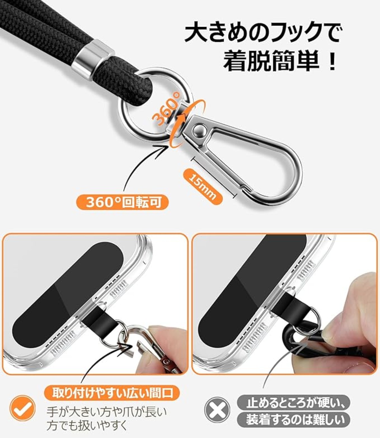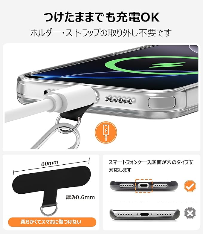 【6mm超薄型TPUパッドで充電もスムーズ】やわらかくて変形しないスマホストラップホルダーは、ケースに挟んでもスマホ充電を妨げないです。柔らかいTPU素材で、スマホを傷つけません。見た目にも自然で、毎日の使用にストレスを感じさせません。※一部の厚手ケースでは充電ケーブルの挿入が困難な場合があります。その際はケースを外すかワイヤレス充電をご利用ください。