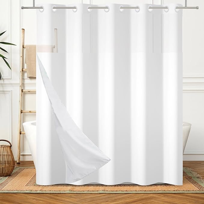 Qinunipoto 白いシャワーカーテン フック不要 90 180cm 無地 白いフックレス スナップインライナー付き 2層防水生地 取付簡単 防カビ 撥水速乾 メッシュトップウィンドウ付き 豪華ホテルお風呂用カーテン バス用品 お風呂場適用 | KAZESHOP