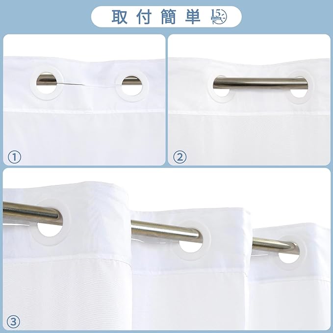 【フックなし】シャワーカーテンの「Cリング」は、フックを取り付けたり、ロッドを外したりすることなく、シャワーカーテンロッドに通すことができます。取り付けに15秒しかかかりません。