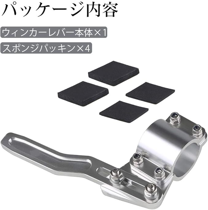 『セット内容』ウィンカーレバー本体 1、スポンジパッキン 4、付属ねじ。実車のレバーのサイズに合わせるために、滑り止め用のゴムで厚さが2種類付属しています。スポンジパッキンは、ウィンカーレバー外径が26-28mmの場合は薄い方、18-25mmの場合は厚い方を選択してください。
