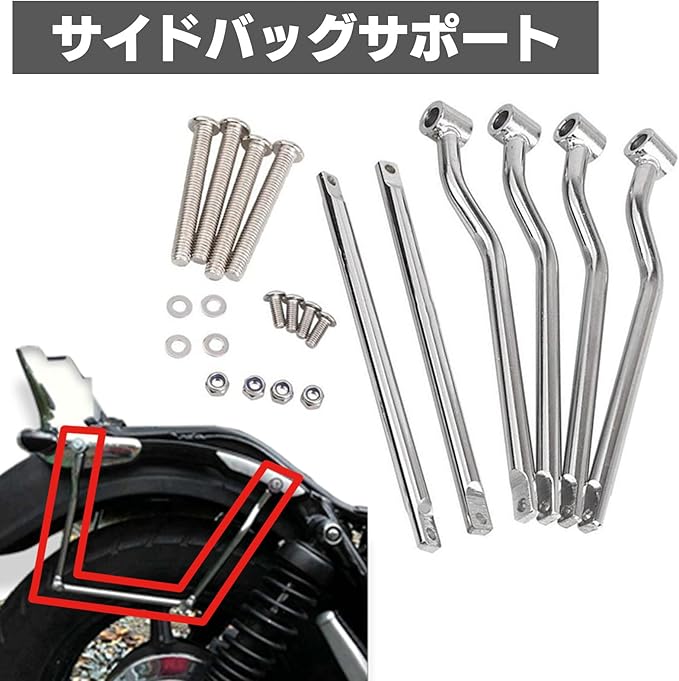 バイクツーリングをもっと快適に!汎用サイドバックサポートとしても使用可能なサイドバッグ取り付けステーで、バッグの傷防止や収納増設を実現。ハーレーはもちろん、国産アメリカンタイプやネイキッドタイプにも対応。ツーリング時の収納スペースを拡張し、快適な旅をサポートします。