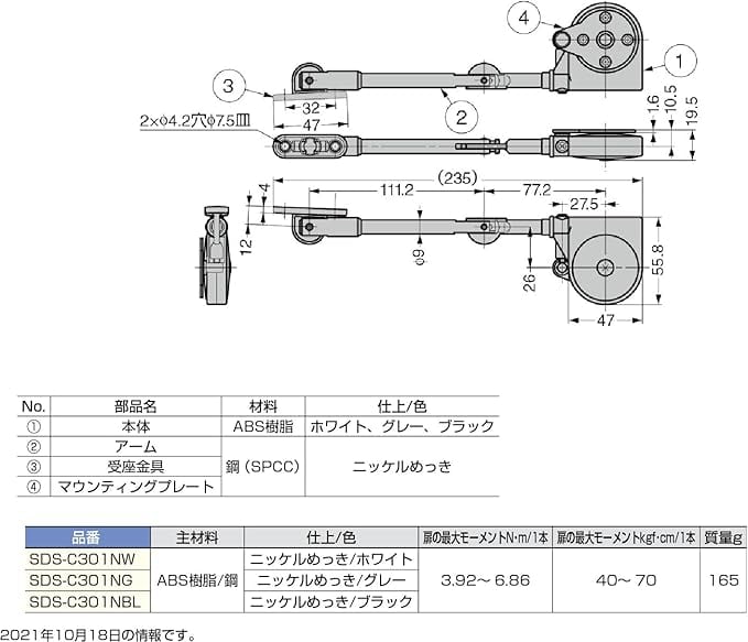 扉を最大に開いた状態および閉じた状態を保持するキャッチを組み込んでいる