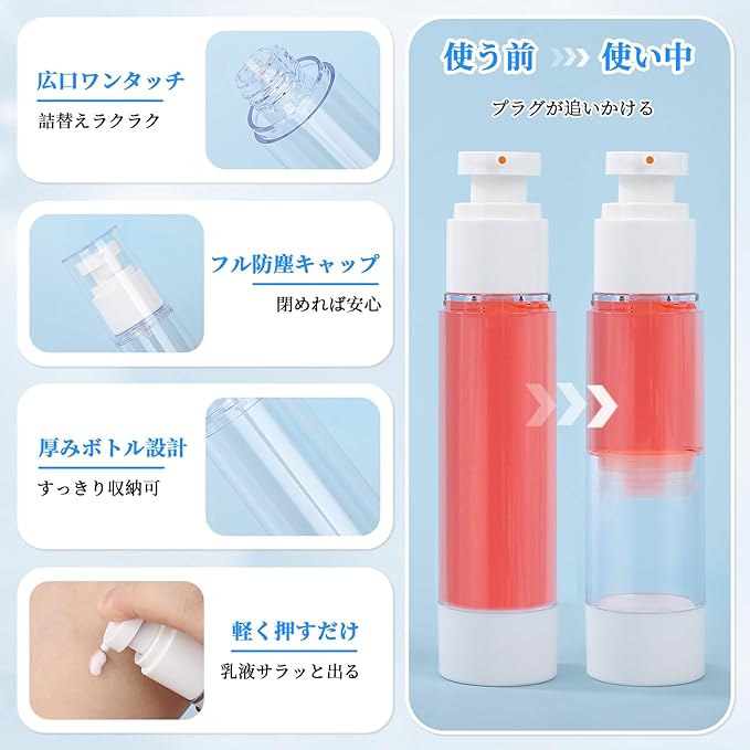 【衛生的なワンプッシュ設計】エアレスポンプが過剰排出を防止。手指接触なしで適量を抽出できるため、雑菌混入リスクを低減。空後は洗浄して繰り返し使用可能。