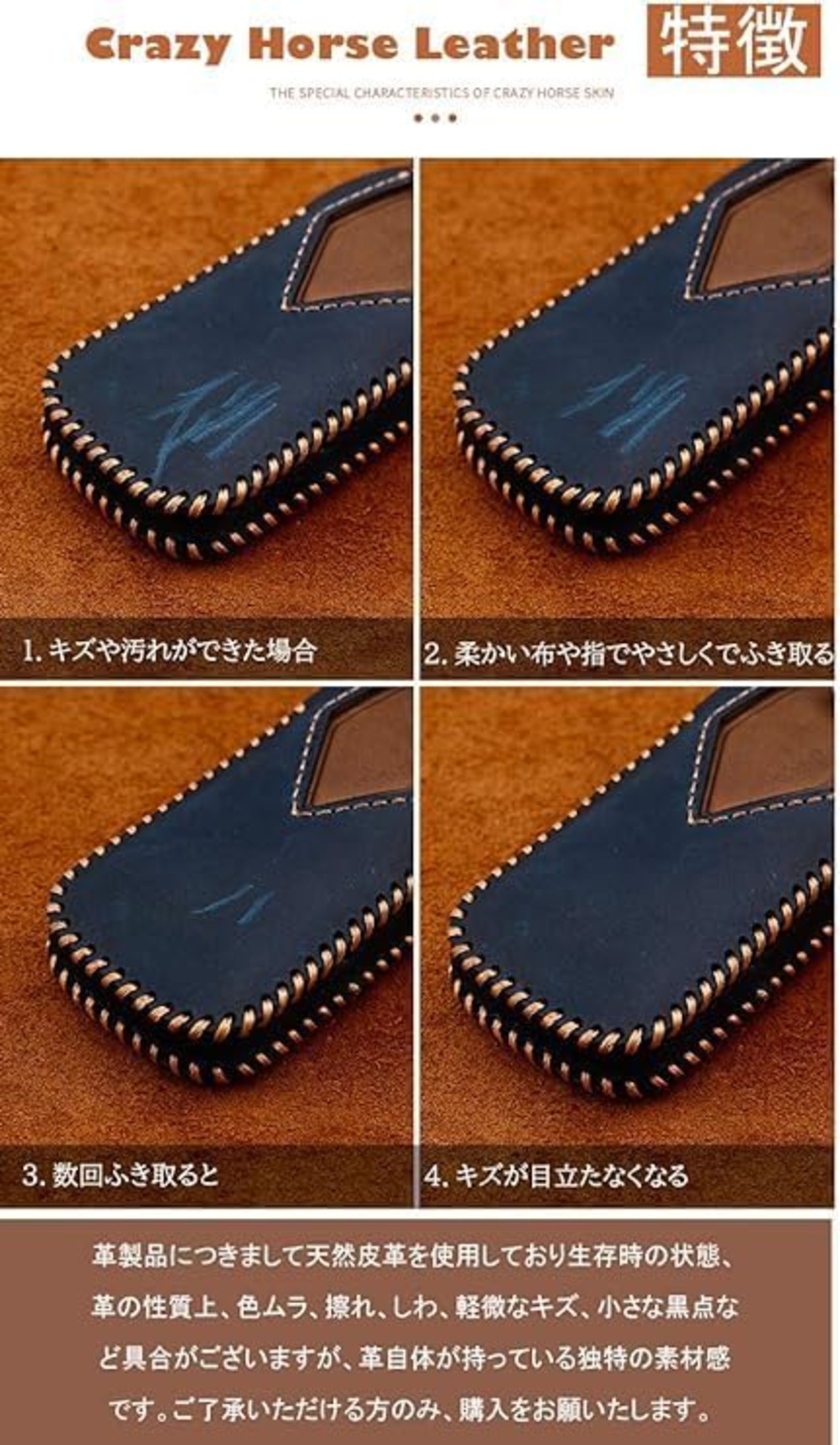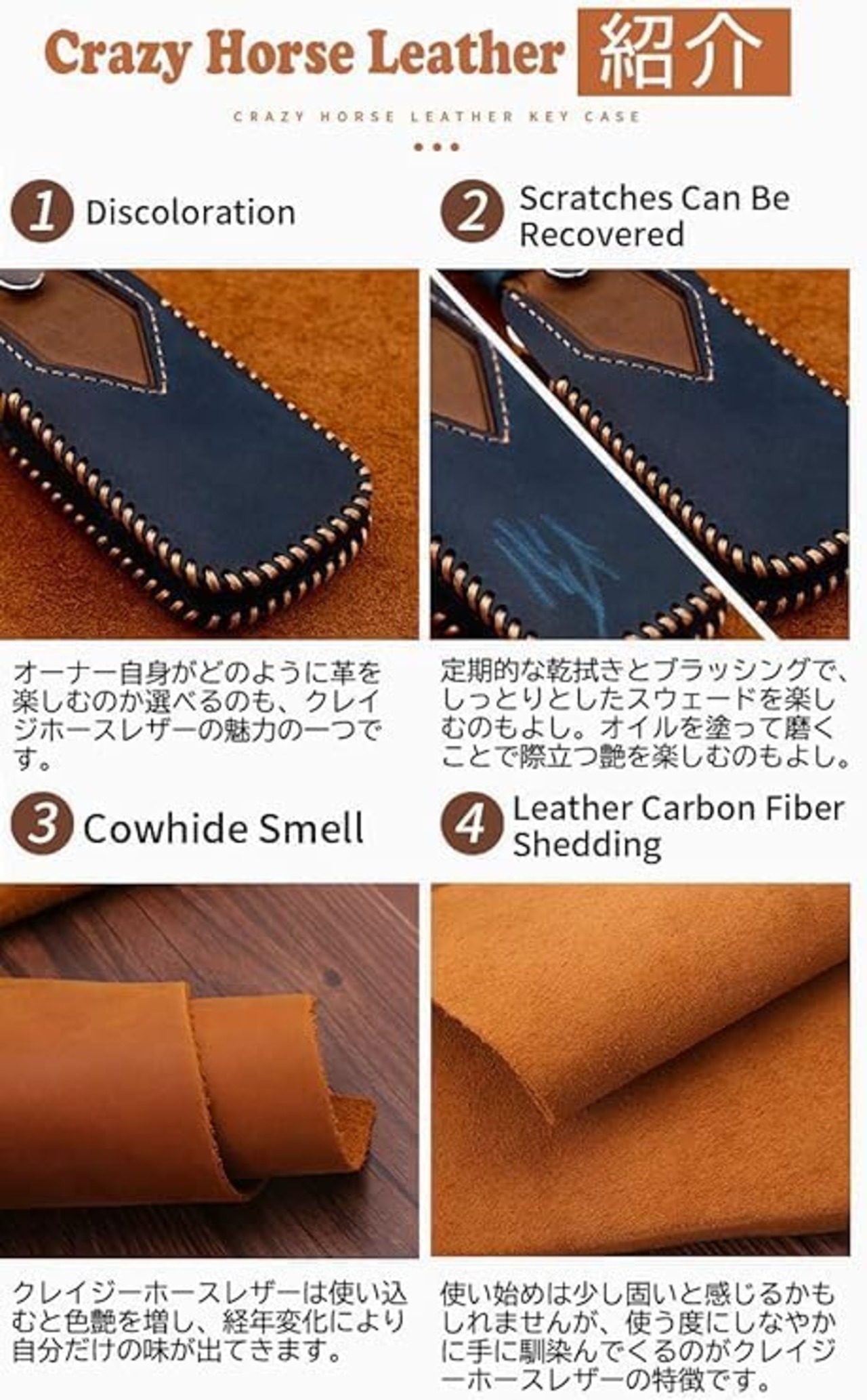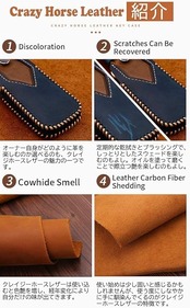 【上質のレザー素材】上質のクレージホースレザーを採用します。生き物からいただいた革は、肌の温もりや安心感も与えてくれる優しい天然素材です。このレザー製品はキズが目立ちますが、使い込むほどに艶が出てきます。