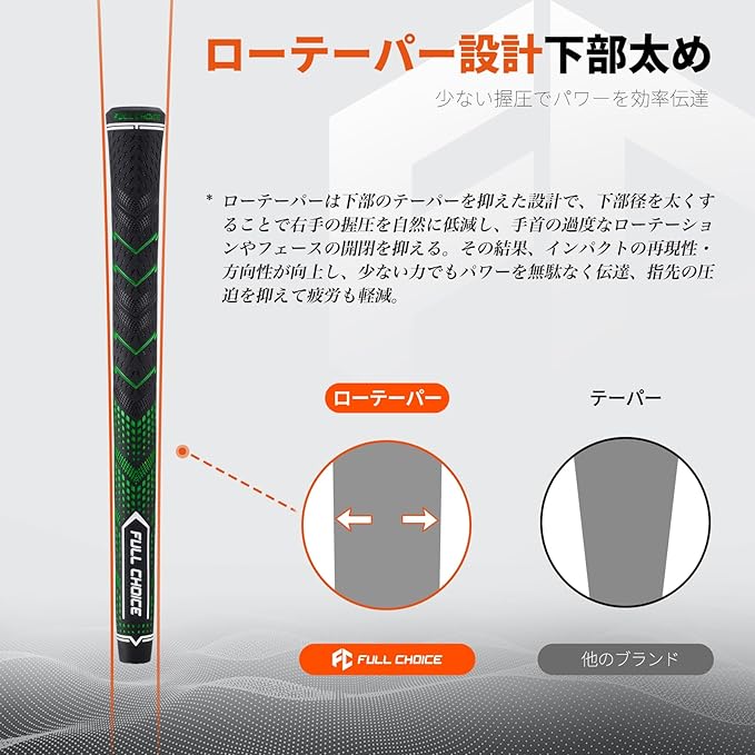 【低テーパー設計】握把下部に科学的な低テーパー構造を採用。手の自然な曲線にフィットし、握力を分散させることでクラブのコントロールが容易になり、ショットの精度を向上させます