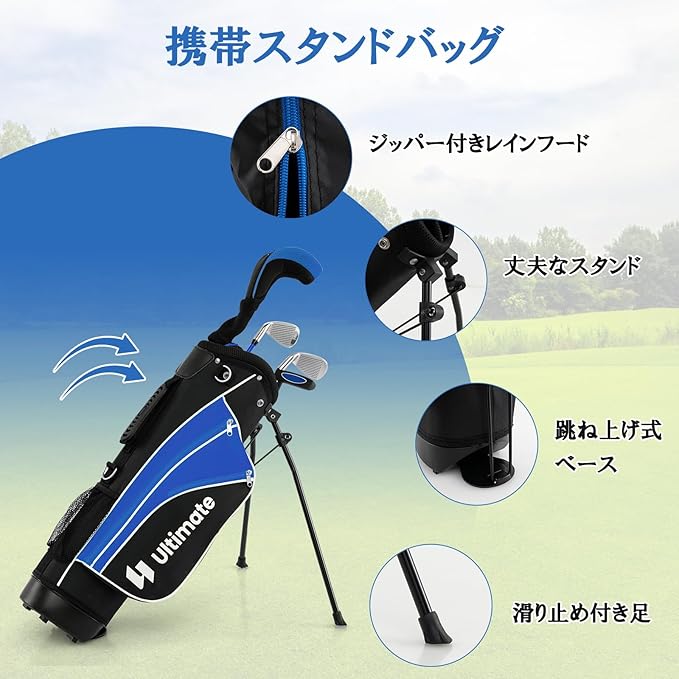 【子供向けに特別設計】#3フェアウェイウッド、#7アイアン、#9アイアン、パターの4種類のクラブとヘッドカバー1本が付属。スタンドバッグも付いており、お子様が生涯楽しめる趣味を身につけるのに役立ちます。