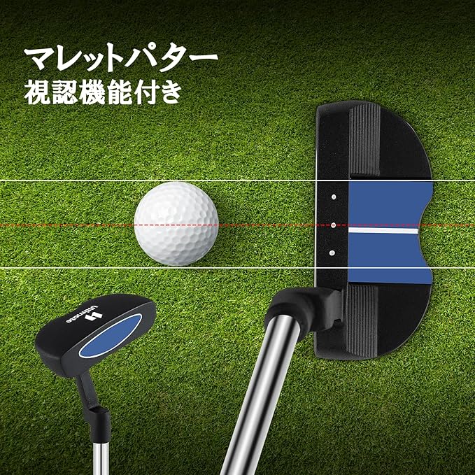 【快適で自信を持って練習】クラブにはすべりにくいTPRグリップが装備されており、子供たちが快適に握ることができます。クラブヘッドの大きなスイートスポットエリアが打球率を向上させ、初心者にもやさしい設計です。さらに、パターにはねらいを助ける機能が付いており、グリーン上の練習に最適です。