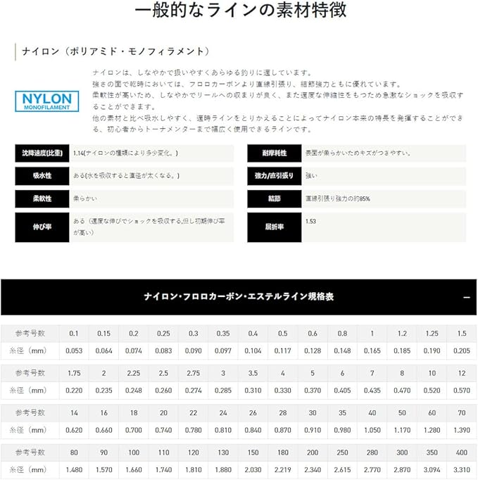 ●巻きグセがつきにくく、強さとしなやかさを合わせ持った糸質は、操作性に優れる上に汎用性も高く、使うフィールドを選びません。 ●初心者からベテランまで、繊細な釣りから大物狙いとあらゆるジャンルの釣りに幅広くお使いいただけるナイロンラインです。 ●2号〜20号には視認性を重視する場合やお好みに合わせてお選びいただけるように、ミストグレー・クリアー・ブルー・ピンク・イエローの5色をラインナップ。