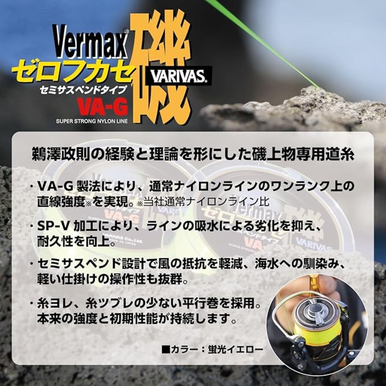 鵜澤正則の経験と理論を形にした磯専用道糸。鵜澤正則の経験と理論から導き出された磯上物専用ライン。特に仕掛け全体が軽い全層仕掛けに最適なモデル。VA-G製法により、通常ナイロンラインのワンランク上の直線強度を実現。更にスーパーフッ素加工(SP-F) により、初期性能も持続。劣化を防ぎ、ライン操作もスムーズ。またセミサスペンド設計により、風の抵抗も軽減。軽い仕掛けでもあらゆる層を攻め切ることができます。平行巻の採用により糸撚れ、糸ツブレも大幅に軽減、安定した品質を保持します。●VARIVAS 独自のVA-G製法で1ランク上の直線強度*を実現。●セミサスペンド設計で風の抵抗を軽減、海水への馴染み、軽い 仕掛けの操作性も抜群。●糸撚れ、糸ツブレの少ない平行巻を採用。本来の強度と初期性能 が持続します。