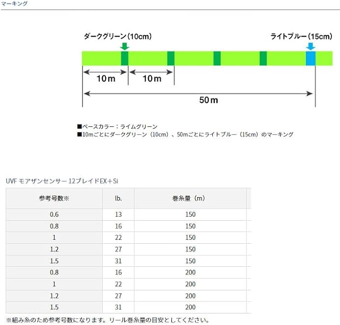 10mごとにダークグリーン(10cm)、50mごとにライトブルー(15cm)のマーキング