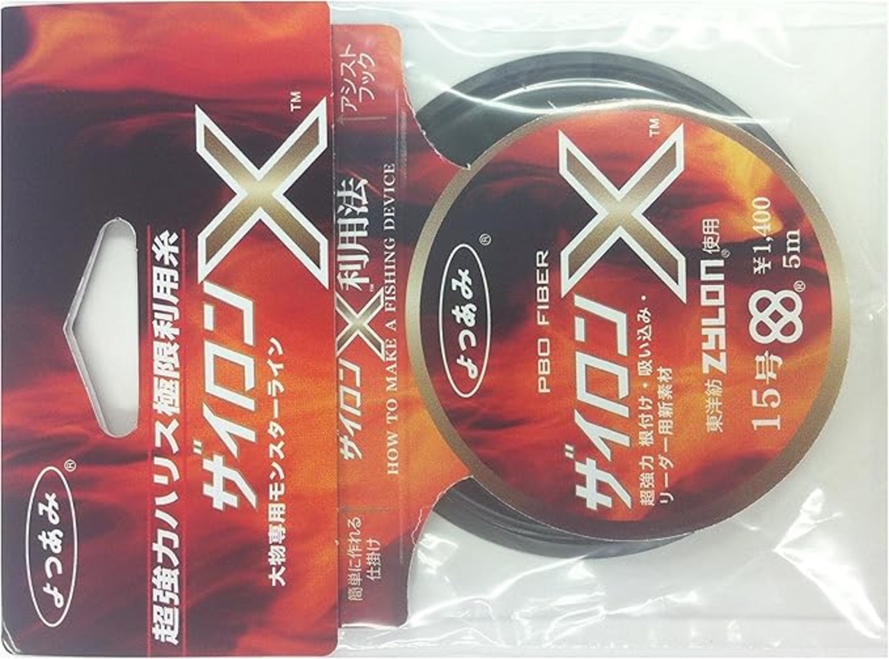 2001年ついに発売となった至上最強のスーパー繊維「ザイロン」製リーダーラインです。パラアラミド(商品名:ケプラート)の約2倍の強度を誇り、その圧倒的な強力と、低伸度、耐切創性は、大物用根付けとして、またアシストフック用ラインとしても最強です。