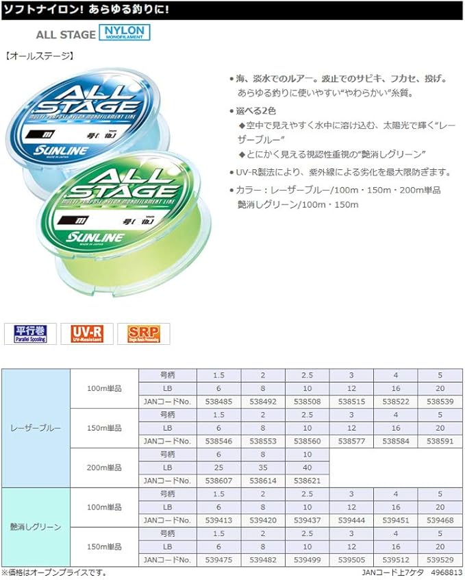 ●海、淡水でのルアー。波止でのサビキ、フカセ、投げ。あらゆる釣りに使いやすい“やわらかい"糸質。 ●空中で見えやすく水中に溶け込む、太陽光で輝く“レーザーブルー"、 とにかく見える視認性重視の“艶消しグリーン"の選べる2色をラインナップ。 ●UV-R製法により、紫外線による劣化を最大限防ぎます。 ※平行巻(100m・150mのみ)