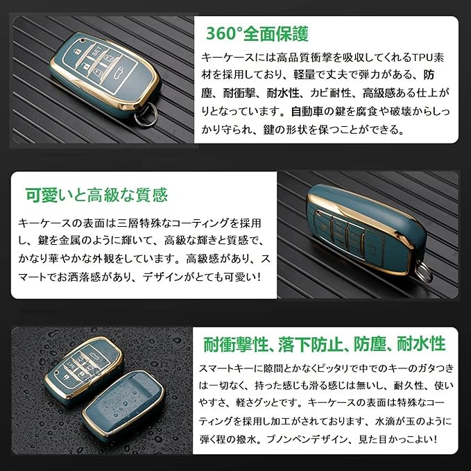 【360 全面保護】キーケースには高品質衝撃を吸収してくれるTPU素材を採用しており、軽量で丈夫で弾力がある、防塵、耐衝撃、耐水性、着地緩衝の効果があります。キーケースの表面は特殊なコーティングを採用し加工がされております、水滴が玉のように弾く程の撥水、自動車の鍵を腐食や破壊からしっかり守られ。360 全面保護、するため 落としてもキーに 傷がつくことはありません。