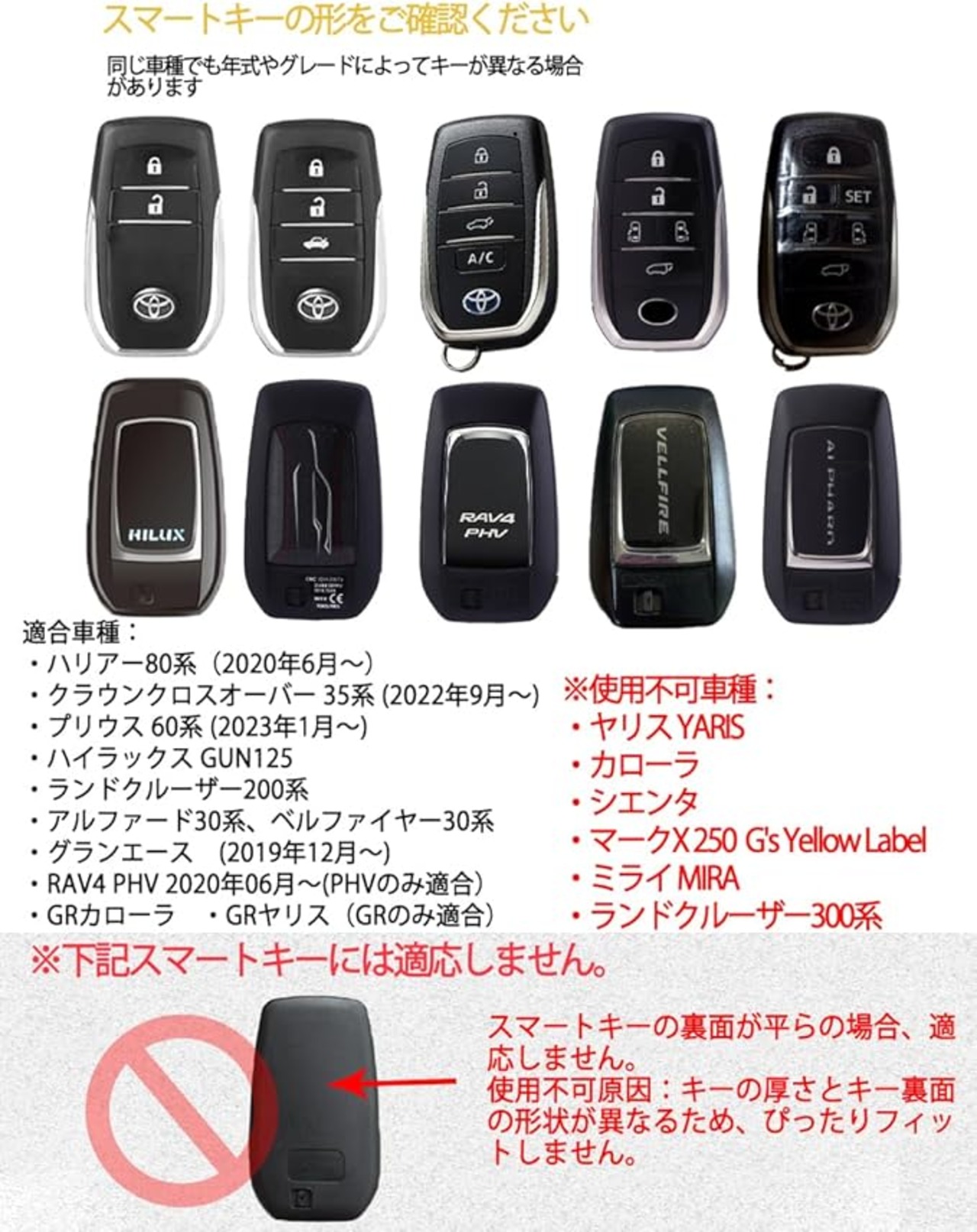 ✅【適合車種】 クラウン クロスオーバー 35系(2022年9月~)、 クラウンスポーツ(2023年10月~)、 ハリアー 80系 、 プリウス 60系 、 ハイラックス GUN125 ランドクルーザー200系 、 RAV4 PHV 2020年06月~(PHV版RAV4のみ適合) グランエース (2019年12月~)、 アルファード ヴェルファイア 30系 前期 2015年(平成27年)1月~ 後期 2018年(平成30年)1月~、アルファード ヴェルファイア 40系、 GRカローラ 、GRヤリス など 【※使用不可車種】:ヤリス YARIS カローラ シエンタ トヨタ ミライ MIRAI MARK X マークX G's Yellow Label ランドクルーザー300系。使用不可原因:キーの厚さとキー裏面の形状が異なるため、ぴったりフィットしません。