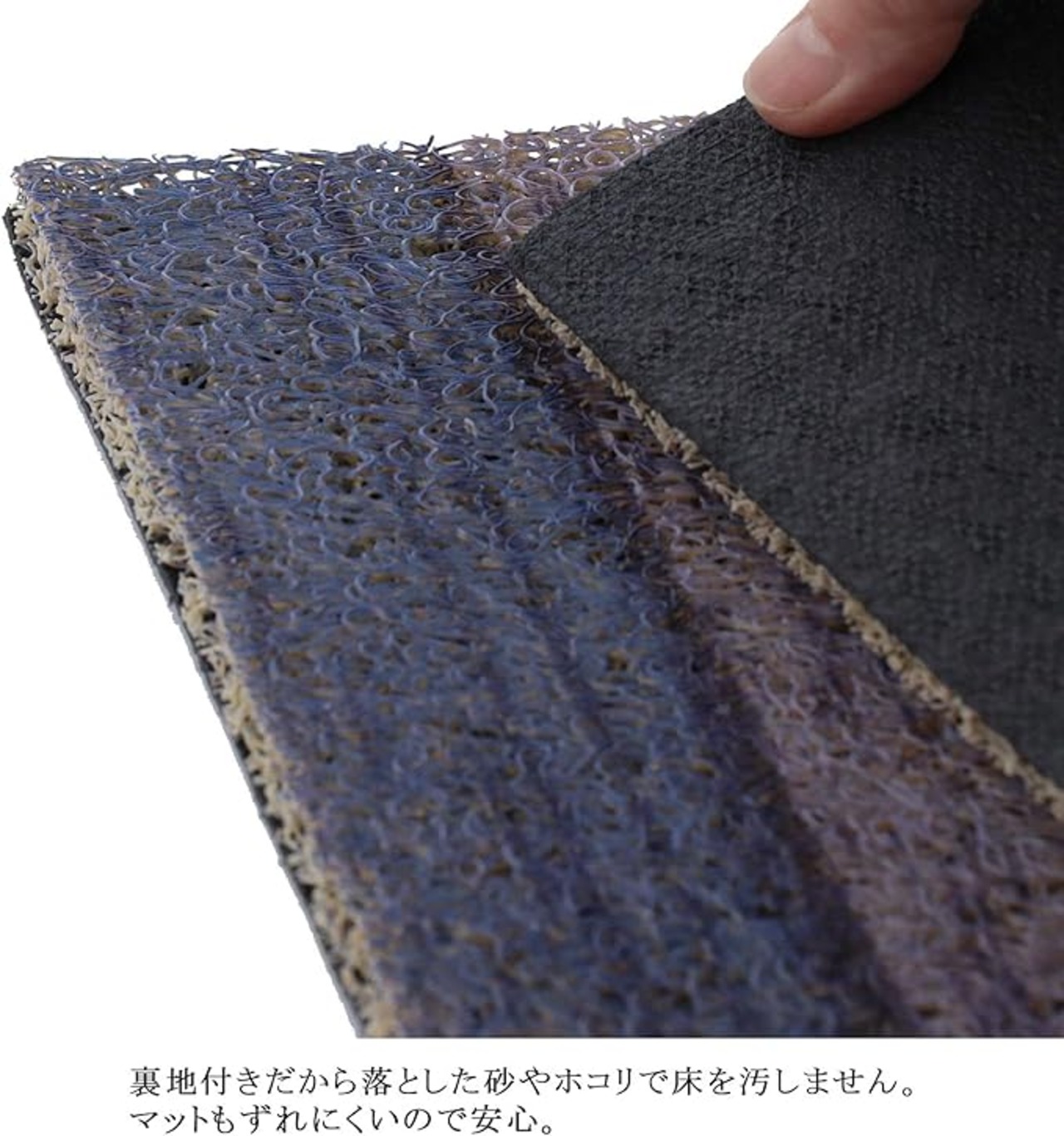 裏地付きだから落とした砂やホコリで床を汚しません。マットもずれにくいので安心。