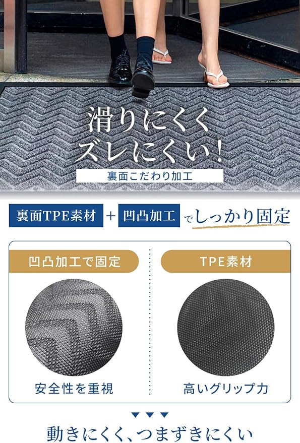 ✅【滑りにくさを重視した設計】 裏面には滑り止め加工が施されており、フローリングやタイル、コンクリートの床にもピタッと密着。マットがズレにくいため、玄関でのつまずきや転倒のリスクを軽減します。お子様や高齢者のいるご家庭でも安心して使える設計で、しっかり足の泥を落とせる便利な玄関マットです。
