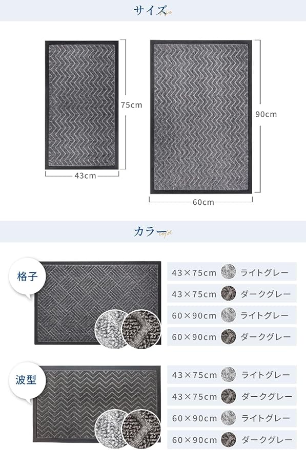 ✅【豊富なバリエーションで多用途に対応】 43 75cmと60 90cmの2サイズ、2色展開、ジグザグ・格子柄の2デザインを組み合わせた多彩なバリエーション。家庭や店舗、オフィスなど場所を問わず使え、インテリアにも馴染みやすいデザインの玄関マットです。