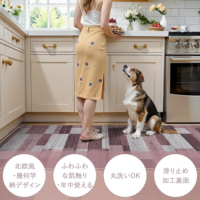 【幅広く活躍】ラグは機械織り製造で、丈夫で破れにくく、床を保護すると同時にインテリアとしても活用できま す。端縁にはオーバーロックの加工を施し、遊び毛が出たり、形を崩れたりしにくく、優れた耐久性を実現 します。また、ほどよい厚さで、オールシーズンお使いできます。玄関、廊下、キッチン、ベッドサイド、リビングルーム、ベランダ、バスルームなどに敷くとぴったりです。