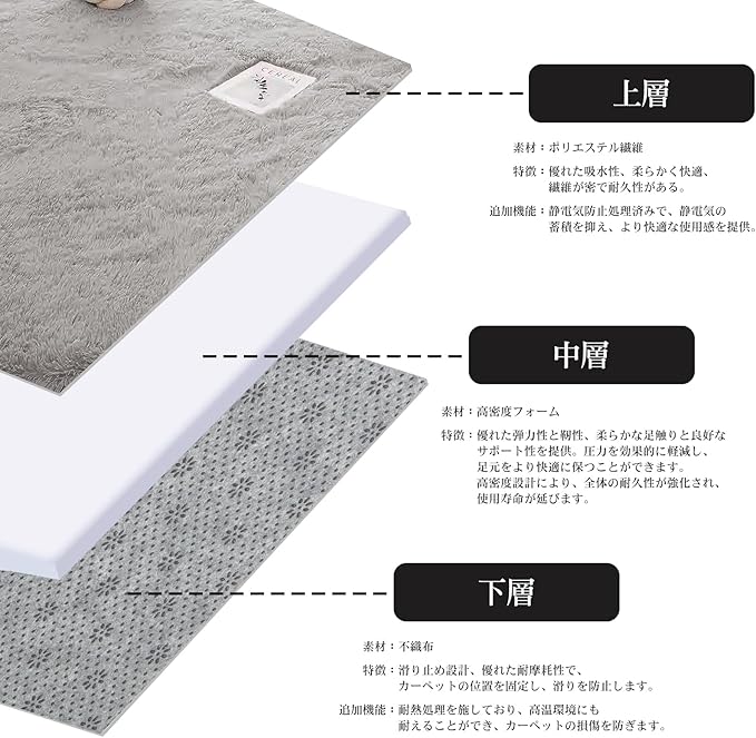 【厚手設計】①毛足の長さ:約40mm ②ポリウレタンの厚さ:約15mm(一般的な製品よりも厚め)③裏地:滑り止め付き不織布。優れた弾力性で防音効果も抜群です。