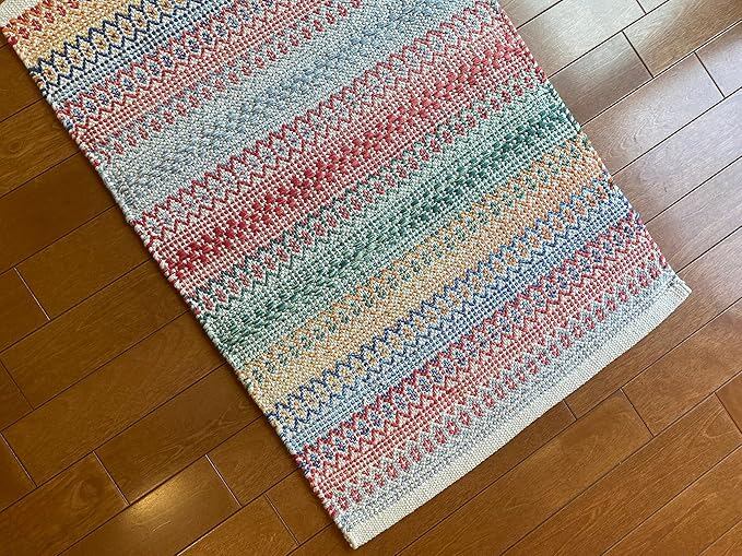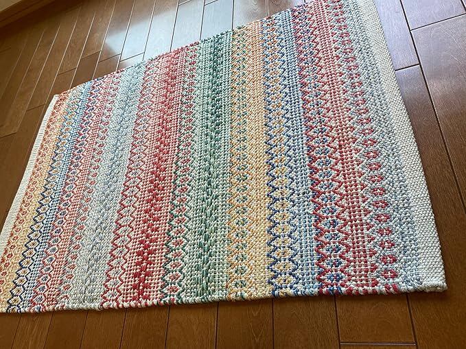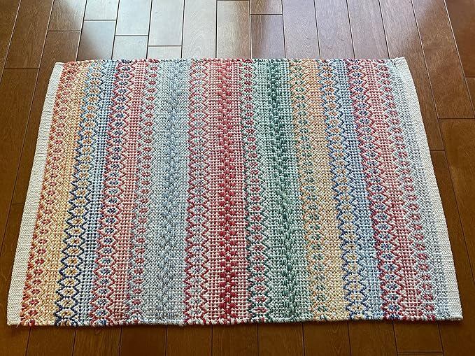 ★インド独特の【マハラジャ】を連想させる色感覚の中から日本に向く色調を選びました。★縦糸 横糸1本1本 ていねいに織り上げられたハンドメイドの商品です。★綿特有の肌触りと美しい色合いは お部屋を明るくします。★玄関だけでなくバスマットでも、インテリアのアクセントとしても幅広くお使いいただけます。★縦横のサイズは手織り(ハンドメイド)の為十分注意しておりますが、表示サイズと誤差が生じる事があります。★生地表面に黒っぽい粒粒が見受けられることがたまにありますが、天然素材である綿花の表皮の一部です。ご安心ください。★滑り止め加工は安心の国内加工です。加工前後の写真のようにインド綿本来の風合いをダメにせず、滑り止めの機能を果たすように配慮をしています。滑り止めは経年劣化いたします。洗濯の頻度、使い方によって効果期間は変わります。場合によっては市販の滑り止めシートをお使いください。