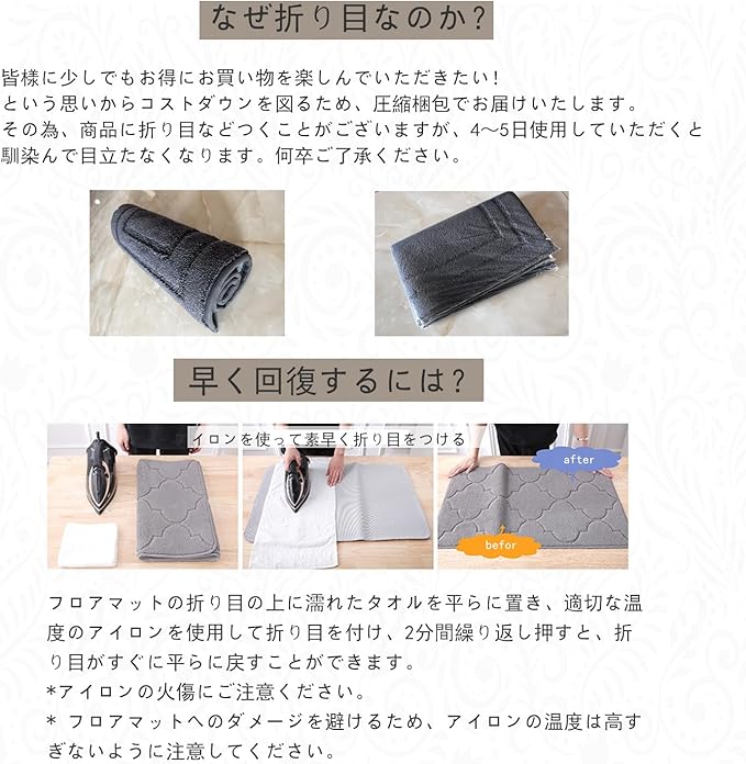 【吸水速乾&滑り止め】マイクロファイバーは通気性が強くて、表面の水分が急速に蒸発し、いつ踏んでも気持ち良くなります。速乾性に優れているので、湿気による細菌の繁殖を抑えます。マットの裏面はTPR材質のすべりどめ加工を施しています。滑り止めに優れ、安全に使えます。子供とお年寄りがいるの家庭でも安心してお使いいただけます。